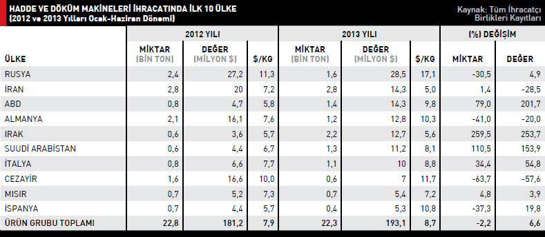 Hadde ve döküm makineleri, kalıplar, aksam ve parçaları sektöründe 2013 yılın Ocak-Haziran döneminde 193,1 milyon dolar değerinde ihracat gerçekleştirildi. 2012 yılının aynı döneminde, söz konusu ürün grubunun ihracatı 181,2 milyon dolardı. Hadde ve döküm makineleri, kalıplar, aksam ve parçaları sektöründe yaşanan ihracat artışı yüzde 6,6 olarak kaydedildi. Hadde ve döküm makineleri, kalıplar, aksam ve parçaları mal grubunda 2013 yılı Ocak-Haziran döneminde en fazla ihracat 28,5 milyon dolarla Rusya’ya gerçekleştirildi. Yüzde 4,9 artışın yaşandığı söz konusu ülkeye 2012 yılının aynı döneminde gönderilen ürünlerin değeri 27,2 milyon dolardı. Listenin ikinci sırasında yer alan İran’a 2013 yılının Ocak-Haziran döneminde 14,3 milyon dolarlık ihracat gerçekleştirildi. Üçüncü sıradaki ABD’ye 2012 yılının Ocak-Haziran döneminde 4,7 milyon dolar değerinde ürün gönderilirken bu rakam yüzde 201,7 artarak 2013 yılının aynı döneminde 14,3 milyon dolar seviyesine yükseldi. Dördüncü sırada bulunan Almanya’ya 2013 yılının Ocak-Haziran döneminde ihraç edilen ürünlerin değeri 12,9 milyon dolar olarak kaydedildi. Listenin beşinci sırasındaki Irak’a 2013 yılının Ocak-Haziran döneminde, hadde ve döküm makineleri, kalıplar, aksam ve parçaları ürün grubunda ihraç edilen ürünlerin değeri 12,7 milyon dolar oldu. Bir önceki yıla göre yüzde 253,7 artışın yaşandığı Irak’a, 2012 yılının aynı döneminde gönderilen ürünlerin değeri 3,6 milyon dolardı. Hadde ve döküm makineleri, kalıplar, aksam ve parçaları sektöründe ihracat artışının en fazla yaşandığı ülke yüzde 253,7 ile Irak oldu. Irak’ın ardından ikinci sırada yüzde 201,7 ile ABD ve üçüncü sırada ise yüzde 153,9 ihracat artışıyla Suudi Arabistan bulunuyor.