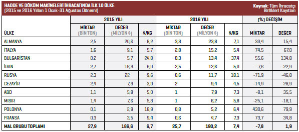 2016 yılının Ocak-Ağustos döneminde Türkiye geneli hadde ve döküm makineleri sektöründe ihracat artışının en fazla yaşandığı ülke yüzde 134,8 ile Bulgaristan oldu. İkinci sırada yüzde 79,9 ile Polonya yer alırken söz konusu ülkeyi yüzde 67 ile İtalya üçüncü sırada takip etti.
