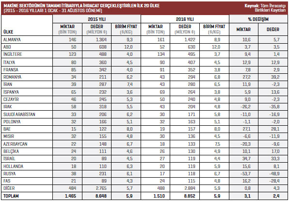 Hadde ve döküm makineleri sektöründe 2016 yılının Ocak-Ağustos döneminde 190,2 milyon dolar değerinde ihracat gerçekleştirildi. 2015 yılının aynı döneminde bu rakam 186,6 milyon dolardı.