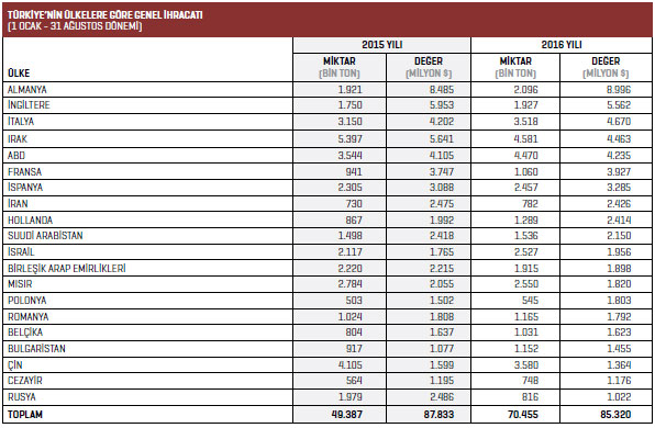 Hadde ve döküm makineleri ürün grubundaki ihracat artışı yüzde 1,9 oldu. Hadde ve döküm makineleri mal grubunda 2016 yılının Ocak-Ağustos döneminde 23,8 milyon dolarla en fazla Almanya’ya ihracat gerçekleştirildi. 2015 yılının aynı döneminde Almanya’ya gönderilen ürünlerin değeri 20,6 milyon dolardı. Söz konusu ülkeye yönelik ihracat artışı yüzde 15,4 oldu. Listenin ikinci sırasında yer alan İtalya’ya 2015 yılının Ocak-Ağustos döneminde 9,1 milyon dolarlık ihracat gerçekleştirilirken 2016 yılının aynı döneminde bu rakam yüzde 67 artışla 15,2 milyon dolar olarak kayda geçti. Üçüncü sıradaki Bulgaristan’a 2016 yılının Ocak-Ağustos döneminde 13,4 milyon dolar değerinde ürün ihraç edildi. 2015 yılında bu rakam 5,7 milyon dolardı. Bulgaristan’a yönelik ihracat artışı yüzde 134,8 oldu. Dördüncü sırada bulunan İran’a 2016 yılının Ocak- Ağustos döneminde12,6 milyon dolarlık ihracat gerçekleştirildi. Listenin beşinci sırasındaki Rusya’ya 2016 yılının Ocak-Ağustos döneminde 11,7 milyon dolar değerinde hadde ve döküm makineleri ihraç edildi.