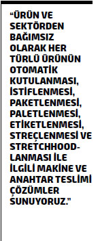 Ürün ve sektörden bağımsız olarak her türlü ürünün otomatik kutulanması, istiflenmesi, paketlenmesi, paletlenmesi, etiketlenmesi, streçlenmesi ve streçhoodlanması ile ilgili makine ve anahtar teslimi çözümler sunuyoruz. Paletleme ve paketlemenin robotik çözümlerinde 10 yılı aşkın süredir önemli bir Japon firmasının yetkili sistem entegratörü olarak güçlü bir işbirliği içerisindeyiz. Ayrıca “high level mekanik palletizerler” ve kartezyen sistemlerle paletleme hatları üretiyoruz. Özellikle 1-50 kilogram arası ağırlıklı kimyasal ham madde, çimento, alçı, un, şeker ve granül gibi torbalı ürünler için otomatik paletleme sistemleri geliştiriyoruz. 3 bin torba/saatlik kapasitelere kadar paletli ya da paletsiz istifleme ve paketleme hatlarımız bulunuyor. Ürünlerimiz; işçilik, ambalaj maliyeti, nakliye güvenliği ve zaman tasarrufu açısından sağladığımız büyük katma değerle, Türkiye ve diğer dünya ülkelerinde sektörün öncü firmaları tarafından memnuniyetle kullanılıyor. Bir Alman firmasıyla birlikte geliştirdiğimiz otomatik şerit çemberleme makineleri ise 15 yılı aşkın süredir 100’e yakın tesiste kullanılıyor. Sektörün en büyük oyuncusu olarak ürettiğimiz otomatik film gerdirmeli palet giydirme sistemi strectchhood makineleri 120 palet/saat kapasitesine sahiptir.