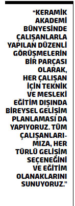yaratmayı amaçlıyoruz. Keramik Akademi bünyesinde çalışanlarla yapılan düzenli görüşmelerin bir parçası olarak, her çalışan için teknik ve mesleki eğitim dışında bireysel gelişim planlaması da yapıyoruz; tüm çalışanlarımıza, her türlü gelişim seçeneğini ve eğitim olanaklarını sunuyoruz. Keramik Akademi kapsamında dil kursları veriyor ve belirli bilgi birikimi, beceri ve yetkinlikleri geliştirmek için iç ve dış eğitim almalarını sağlıyoruz.
