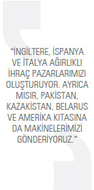 unda da yakalamak istiyoruz. Özellikle son yıllarda ürettiğimiz makineler firmamızın büyümesine büyük bir katkı sağladı. Zira bir makinemiz bugün itibarıyla dünya üzerinde sadece firmamız tarafından üretiliyor. Ayrıca yine bir başka makinemiz de firma ihtiyaçlarına göre özel olarak imal edildiği için son derece iyi satış rakamlarına sahip.
