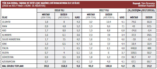 2017 yılının Ocak-Ağustos döneminde Türkiye geneli yük kaldırma, taşıma ve istifleme makineleri ürün grubunda en fazla ihracat artışı yüzde 489 ile İtalya’da yaşandı. Söz konusu ülkenin ardından yüzde 97,5 ile İran gelirken, yüzde 68,7 ile Azerbaycan üçüncü sırada yer aldı.