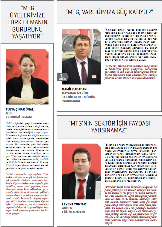 İki yılda bir düzenlenen Blechexpo Fuarına bu yıl 36 ülkeden 1234 firma katıldı. MTG, 38 bin kişinin ziyaret ettiği fuarın 3’üncü holündeki 30 metrekarelik stantta, fuar katılımcılarını ve ziyaretçileri Türk makine sektörü hakkında bilgilendirdi. MTG ayrıca Türk makinesinin görünürlüğünü artırmak için fuar girişiyle fuar alanındaki pankartlar ve boardlara, şehir merkezinde çalışan 10 otobüs ve 10 tramvaya, fuar gazetesine, fuarla eş zamanlı olarak Almanya’da yayınlanan sektörel dergilere; “We’re Highly Qualified And Standardized”, “We’re Closer Than You Think”, “We’re Young And Dynamic!” ve “We Have Entrepreneurial Spirit” sloganları çerçevesinde tasarlanan “Turkish Machinery” imzalı çok sayıda reklam verdi. Makine İhracatçıları Birliğinin (MAİB) Turquality projesi kapsamında hazırlatılan makine ekinin yer aldığı 3 Kasım tarihli Die Welt gazetesi de fuarın ilk günü katılımcı firmalara dağıtıldı. Fuarda ziyaretçileri, katılımcı Türk firmalarına yönlendirebilmek amacıyla stant yerlerini ve ürünlerini gösteren bir broşür de hazırlandı.