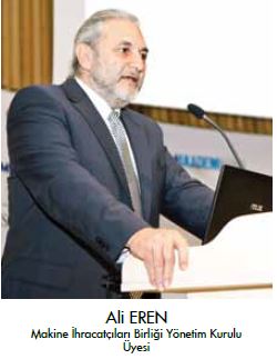 Ali Eren konuşmasında özetle şu bilgileri paylaştı: “İhracatın ithalatı karşılama oranı, 10 yılda yüzde 27’lerden yüzde 46 seviyesine çıktı. Bu rakamlar dikkate alındığında; 2010 ve 2023 yıllarında gerçekleşecek yıllık ortalama ihracat artışı yüzde 19,4 seviyelerinde gerçekleşirse 2023 yılında 100 milyar dolar makine ihracatına ulaşılabilir.2012 yılında 2,1 trilyon dolarlık dünya ithalatının 2023 yılında yüzde 6 ortalama artış ile 3,8 trilyon dolara ulaşması bekleniyor. 2012 yılında, 13 milyar dolar ile dünya pazarında yüzde 0,61 paya sahip olan Türkiye, 2023 yılında 100 milyar dolar ile dünya pazarından yüzde 2,62’lik pay alabilir.Türkiye makine ihracatının 100 milyar dolara çıkmaması durumunda, genel ihracat hedefi olan 500 milyar dolara ulaşması da mümkün olmayacaktır.Hedeflere ulaşabilmek için kendi teknolojimizi üretmekten başka seçenek bulunmuyor. Bununla beraber, çok istikrarlı bir artış gerçekleştirmemiz gerekiyor. Her ne kadar ithalatla da ilgili olumlu gelişmeler yaşansa da genelde ithalatın ihracattan daha hızla arttığı ortadadır.