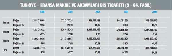 “ TÜİK verilerine göre; 2009 yılında ülkemizin 84. fasıl itibariyle makine ve aksamları sektörü ihracatında 3. sırada bulunan Fransa, sektör ihracatımızdan yüzde 6,7 pay aldı. Fransa’dan ithalatımız da yüzde 0,57 oranında artarak 1.357 milyon dolara çıktı”