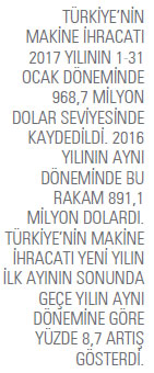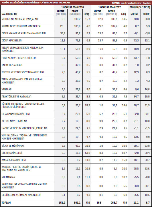 Makine sektöründe 2017 yılının 1-31 Ocak döneminde en fazla ihracat gerçekleştiren alt sektör motorlar oldu. 2016 yılının 1-31 Ocak döneminde söz konusu ürün grubunda gerçekleştirilen ihracatın değeri 136,2 milyon dolarken 2017 yılının aynı döneminde bu rakam yüzde 36,8 artışla 186,4 milyon dolar seviyesine ulaştı. Listenin ikinci sırasında bulunan klimalar ve soğutma makineleri kaleminde 2017 yılının 1-31 Ocak döneminde gerçekleştirilen ihracatın değeri 109,9 milyon dolar oldu. 2016 yılının aynı döneminde bu rakam 103,8 milyon dolardı. Klimalar ve soğutma makineleri mal grubunda gerçekleşen ihracat artışı yüzde 5,9 oldu.