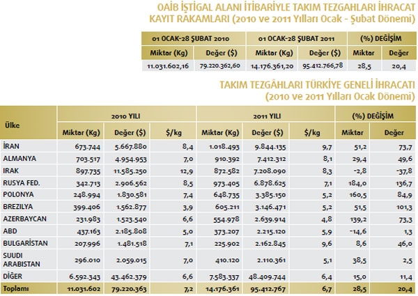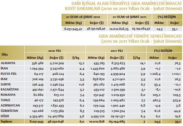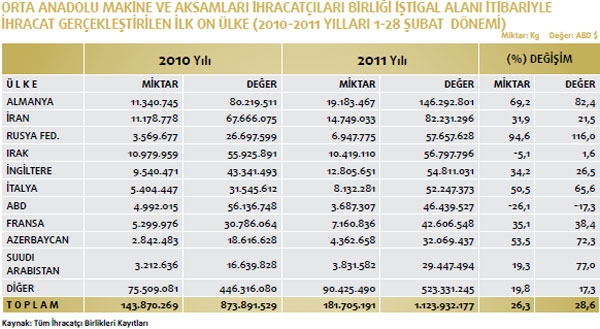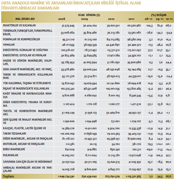 Makine ve Aksamları İhracatçıları Birliği iştigal alanına giren GTİP’ler kapsamında belirlenen Türkiye geneli ihracat kayıtlarına göre; 2010 yılı Ocak-Şubat döneminde ihracat kayıt rakamı 873 milyon 891 bin dolarken, bu rakam 2011 yılı aynı döneminde yüzde 28,6 oranında artarak 1 milyar 123 milyon 932 bin dolara yükseldi. Makine sektörü toplamı 84’üncü faslın tamamı ve 84’üncü fasıl dışı Makine ve Aksamları İhracatçıları Birliği iştigal alanı toplamından oluşan makine sektörünün tamamının ihracatı 2010 yılı Ocak-Şubat döneminde 1 milyar 394 milyon 470 bin dolar iken, bu rakam 2011 yılı aynı döneminde yüzde 20,2 oranında artarak 1 milyar 675 milyon 987 bin dolara yükseldi.Mal grupları bazında incelendiğinde ise 2011 yılı Ocak-Şubat dönemi ihracatında en fazla artışın motorlar, aksam ve parçalarında yaşandığı ortaya çıktı. Yüksek artış gösteren kalemlerin ilki yüzde 596,1 ile motorlar, aksam ve parçaları; ikincisi yüzde 75,2 ile ambalaj makineleri aksam ve parçaları; üçüncüsü yüzde 68,1 ile deri işleme ve imalat makineleri oldu. Daha sonra sırasıyla yüzde 68 ile reaktörler ve kazanlar ile yüzde 60 oranıyla savunma sanayii için silah ve mühimmat olarak gerçekleşti. OAİB iştigal alanına giren ürünler itibariyle, mal gruplarının sektör ihracatından aldıkları pay incelendiğinde; 2011 yılı Ocak-Şubat döneminde; yüzde 15,4 pay ile endüstriyel klimalar ve soğutma makineleri birinci; yüzde 13,6 pay ile inşaat ve madencilikte kullanılan makineler ikinci; yüzde 8,8 pay ile pompa ve kompresörler üçüncü sırada yer aldı.