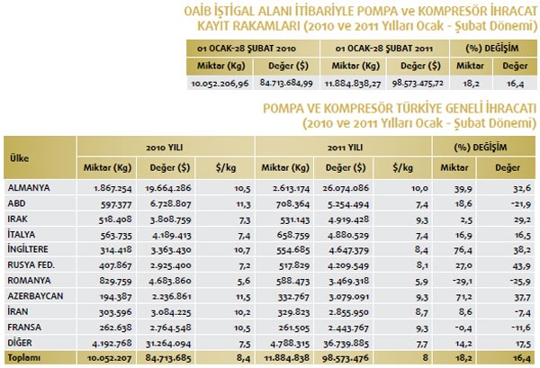 Makine ve aksamları ihracatımızın en önemli kalemlerinden biri olan gıda sanayii makineleri ihracatımız 2011 yılının Şubat döneminde artış kaydetti. Geçtiğimiz yılın Şubat dönemi ile karşılaştırıldığında değer bazında yüzde 35,1 yükseldi. Değer olarak ise 2010 yılının Şubat döneminde 48 milyon 250 bin dolar olan gıda s anayii makineleri ihracatımız, 2011 yılının Şubat döneminde ise yüzde 35,1 oranında artarak 65 milyon 194 bin dolar oldu. Gıda sanayii makineleri ihracatımızın en fazla olduğu yer ise Almanya. Söz konusu yere 2011 yılının Şubat döneminde 8 milyon 323 bin dolarlık gıda sanayii makineleri ihracatı gerçekleştirildi. Bu mal grubu içerisindeki en büyük ikinci ihracat pazarımızın ise İran olduğu görülüyor. İran’a 2010 yılının Şubat döneminde 5 milyon 474 bin dolarlık gıda sanayii makineleri ihracatımız söz konusu iken 2011 yılının aynı dönemine gelindiğinde 5 milyon 687 bin dolar ihracat düzeyi yakalandı. Gıda sanayii makineleri ihracatımızın üçüncü en büyük pazarı ise Rusya Federasyonu oldu. Rusya Federasyonu’na 2010 yılının Şubat döneminde 408 bin dolarlık gıda sanayii makineleri ihracatımız söz konusu GIDA SANAYİİ MAKİNELERİ iken 2011 yılının aynı dönemine gelindiğinde 4 milyon 939 bin dolara gerilediği görüldü. Gıda sanayii makineleri ihracatımızda dördüncü sırada Irak yer alıyor. Irak’a 2010 yılında 3 milyon 732 bin dolarlık ihracat gerçekleşirken 2011 yılında 4 milyon 711 bin dolar ihracat gerçekleşti. Gıda sanayii makineleri ihracatımızın 2011 yılı Şubat döneminde en fazla artış gösterdiği ilk beşte yer alan beşinci ülkenin ise Suriye olduğu açıklandı. Suriye’ye 2010 yılında 2 milyon 746 bin dolar ihracat yaparken 2011 yılında 2 milyon 413 bin dolar ihracat gerçekleşti. Gıda sanayii makineleri ihracatımızda değer bakımdan ise ilk üç sırada yüzde 1.110,1 değer artışı ile Rusya Federasyonu yer alıyor. Söz konusu ülkeden sonra yüzde 573,9 ile Tunus ve sonrasında yüzde 229,5 oranında yükselişle Romanya takip ediyor. POMPA ve KOMPRESÖ R Makine ve aksamları ihracatımızın en önemli kalemlerinden biri olan pompa ve kompresör ihracatımız 2011 yılının Şubat döneminde artış kaydetti. Geçtiğimiz yılın Şubat dönemi ile karşılaştırıldığında değer bazında yüzde 16,4 yükseldi. Değer olarak ise 2010 yılının Şubat döneminde 84 milyon 713 bin dolar olan pompa ve kompresör ihracatımız, 2011 yılının Şubat döneminde ise yüzde 16,4 oranında artarak 98 milyon 573 bin dolar oldu. Pompa ve kompresör ihracatımızın en fazla olduğu yer ise Almanya. Söz konusu yere 2011 yılının Şubat döneminde 26 milyon 74 bin dolarlık pompa ve kompresör ihracatı gerçekleştirildi. Bu mal grubu içerisindeki en büyük ikinci ihracat pazarımızın ise ABD olduğu görülüyor. ABD’ye 2010 yılının Şubat döneminde 6 milyon 728 bin dolarlık pompa ve kompresör ihracatımız söz konusu iken 2011 yılının aynı dönemine gelindiğinde 5 milyon 254 bin dolar ihracat düzeyi yakalandı. Pompa ve kompresör ihracatımızın üçüncü en büyük pazarı ise Irak oldu. Irak’a 2010 yılının Şubat döneminde 3 milyon 808 bin dolarlık pompa ve kompresör ihracatımız söz konusu iken 2011 yılının aynı dönemine gelindiğinde 4 milyon 919 bin dolara gerilediği görüldü. Pompa ve kompresör ihracatımızda dördüncü sırada İtalya yer alıyor. İtalya’ya 2010 yılında 4 milyon 189 bin dolarlık ihracat gerçekleşirken 2011 yılında 4 milyon 880 bin dolar ihracat gerçekleşti. Pompa ve kompresör ihracatımızın 2011 yılı Şubat döneminde en fazla artış gösterdiği ilk beşte yer alan beşinci ülkenin ise İngiltere olduğu açıklandı. İngiltere’ye 2010 yılında 3 milyon 363 bin dolar ihracat yaparken 2011 yılında 4 milyon 647 bin dolar ihracat gerçekleşti. Pompa ve kompresör ihracatımızda değer bakımdan ise ilk üç sırada yüzde 43,9 değer artışı ile Rusya Federasyonu yer alıyor. Söz konusu ülkeden sonra yüzde 38,2 ile İngiltere ve sonrasında yüzde 37,7 oranında yükselişle Azerbaycan takip ediyor.