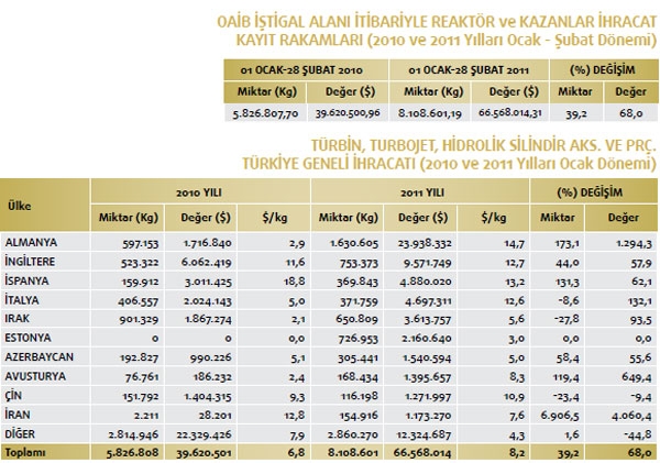 Makine ve aksamları ihracatımızın en önemli kalemlerinden biri olan reaktör ve kazanlar ihracatımız 2011 yılının Şubat döneminde artış kaydetti. Geçtiğimiz yılın Şubat dönemi ile karşılaştırıldığında değer bazında yüzde 68,0 yükseldi. Değer olarak ise 2010 yılının Şubat döneminde 39 milyon 620 bin dolar olan reaktör ve kazanlar ihracatımız, 2011 yılının Şubat döneminde ise yüzde 68,0 oranında artarak 66 milyon 568 bin dolar oldu. Reaktör ve kazanlar ihracatımızın en fazla olduğu yer ise Almanya. Söz konusu yere 2011 yılının Şubat döneminde 23 milyon 938 bin dolarlık reaktör ve kazanlar ihracatı gerçekleştirildi. Bu mal grubu içerisindeki en büyük ikinci ihracat pazarımızın ise İngiltere olduğu görülüyor. İngiltere’ye 2010 yılının Şubat döneminde 6 milyon 62 bin dolarlık reaktör ve kazanlar ihracatımız söz konusu iken 2011 yılının aynı dönemine gelindiğinde 9 milyon 571 bin dolar ihracat düzeyi yakalandı. Reaktör ve kazanlar ihracatımızın üçüncü en büyük pazarı ise İspanya oldu. İspanya’ya 2010 yılının Şubat döneminde 3 milyon 11 bin dolarlık reaktör ve kazanlar ihracatımız söz konusu iken 2011 yılının aynı dönemine gelindiğinde 4 milyon 880 bin do lara gerilediği görüldü. Reaktör ve kazanlar ihracatımızda dördüncü sırada İtalya yer alıyor. İtalya’ya 2010 yılında 2 milyon 24 bin dolarlık ihracat gerçekleşirken 2011 yılında 4 milyon 697 bin dolar ihracat gerçekleşti. Reaktör ve kazanlar ihracatımızın 2011 yılı Şubat döneminde en fazla artış gösterdiği ilk beşte yer alan beşinci ülkenin ise Estonya olduğu açıklandı. Estonya’ya 2010 yılında hiç ihracat yapmazken 2011 yılında 2 milyon 160 bin dolar ihracat gerçekleşti. Reaktör ve kazanlar ihracatımızda değer bakımdan ise ilk üç sırada yüzde 4.060,4 değer artışı ile İran yer alıyor. Söz konusu ülkeden sonra yüzde 1.294,3 ile Almanya ve sonrasında yüzde 649,4 oranında yükselişle Avusturya takip ediyor.