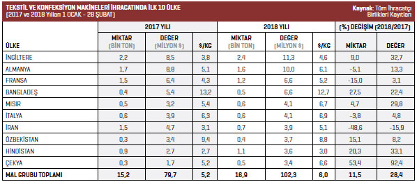 2018 yılının Ocak-Şubat döneminde Türkiye geneli tekstil ve konfeksiyon makineleri sektöründe en fazla ihracat artışı yüzde 92,4 ile Çekya’da yaşandı. Yüzde 33,1 ile Hindistan ikinci sırada gelirken yüzde 32,7 ile İngiltere üçüncü sırada bulunuyor.
