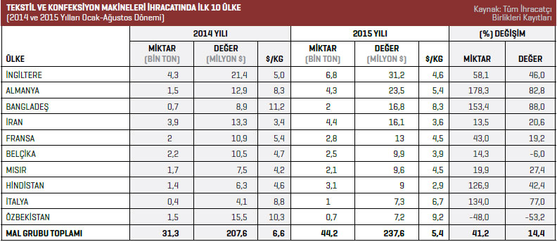 Tekstil ve konfeksiyon makineleri ürün grubu ihracatı 2015 yılının Ocak-Ağustos döneminde, 2014 yılının aynı dönemine göre yüzde 14,4 artış göstererek 237,6 milyon dolar değerine ulaştı. Tekstil ve konfeksiyon makineleri mal grubunda 2014 yılının Ocak-Ağustos döneminde ihraç edilen ürünlerin değeri ise 207,6 milyon dolar seviyesindeydi. Tekstil ve konfeksiyon makineleri sektöründe 2015 yılının Ocak-Ağustos döneminde en fazla ihracat gerçekleştirilen ülke 31,2 milyon dolarla İngiltere oldu. Yüzde 46 artışın yaşandığı söz konusu ülkeye, 2014 yılının aynı döneminde 21,4 milyon dolar değerinde ürün ihraç edilmişti. Listenin ikinci sırasında bulunan Almanya’ya 2015 yılının Ocak-Ağustos döneminde 23,5 milyon dolarlık ihracat gerçekleştirildi. 2014 yılının aynı döneminde bu rakam 12,9 milyon dolar seviyesindeydi. Almanya’ya yönelik ihracat artışı yüzde 82,8 olarak kaydedildi. Üçüncü sıradaki Bangladeş’e 2014 yılının Ocak- Ağustos döneminde 8,9 milyon dolarlık tekstil ve konfeksiyon makinesi ihraç edilirken 2015 yılının aynı döneminde bu rakam yüzde 88 artışla 16,8 milyon dolar oldu. Listenin dördüncü sırasında yer alan İran’a yönelik tekstil ve konfeksiyon makineleri ihracatı 2015 yılının Ocak-Ağustos döneminde, geçen yılın aynı dönemine göre yüzde 20,6 artış gösterdi. 2014 yılının Ocak- Ağustos döneminde 13,3 milyon dolarlık ürün gönderilen İran’a, 2015 yılının aynı döneminde ihraç edilen ürünlerin değeri 16,1 milyon dolara yükseldi. Listenin beşinci sırasında yer alan Fransa’ya 2015 yılının Ocak-Ağustos döneminde 13 milyon dolar değerinde ihracat gerçekleştirildi. 2014 yılının aynı döneminde bu rakam 10,9 milyon dolardı. Fransa’ya yönelik ihracat artışı yüzde 19,2 oldu.