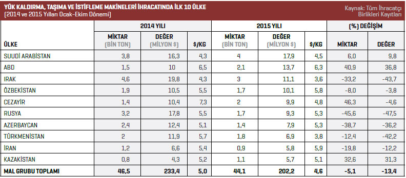 Yük kaldırma, taşıma ve istifleme makineleri ürün grubunda 2015 yılının Ocak- Ekim döneminde 1 7 , 9 milyon dolarla en fazla Suudi Arabistan’a ihracat gerçekleştirildi. Söz konusu ülkeye 2014 yılının aynı döneminde gönderilen ürünlerin değeri 16,3 milyon dolardı. Suudi Arabistan’a yönelik ihracat yüzde 9,8 arttı. Listenin ikinci sırasında bulunan ABD’ye 2014 yılının Ocak-Ekim döneminde 10 milyon dolarlık ihracat gerçekleştirilirken 2015 yılının aynı döneminde bu rakam yüzde 36,8 artışla 13,7 milyon dolar oldu. Listenin üçüncü sırasında bulunan Irak’a 2015 yılının Ocak- Ekim döneminde 11,1 milyon dolarlık ihracat gerçekleştirildi. Dördüncü sırada yer alan Özbekistan’a 2015 yılının Ocak-Ekim döneminde 10,1 milyon dolarlık ihracat gerçekleştirildi. Beşinci sıradaki Cezayir’e 2015 yılının Ocak-Ekim döneminde ihraç edilen yük kaldırma, taşıma ve istifleme makinelerinin değeri 9,9 milyon dolar oldu.