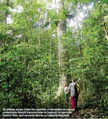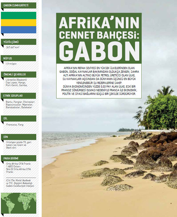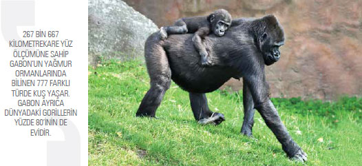 oluşturuyor. Gabon makamları, işsizliği azaltmak ve ekonomik büyümeyi teşvik etmek için 2010 yılı Ocak ayı itibarıyla ülkeden kereste ihracatını yasaklamıştır. Balıkçılıkta da önemli bir potansiyele sahip olan ülkenin 800 kilometre uzunluğunda sahil şeridi ve çeşitli balık türlerine ev sahipliği yapan 10 bin kilometrekarelik göl ve nehir potansiyeli söz konusu. Afrika’nın refah seviyesi en yüksek ülkelerinden biri olan Gabon, doğal kaynaklar bakımından da oldukça zengindir. Ülke, Sahra Altı Afrika’nın altıncı büyük petrol üreticisidir. Petrolün yanı sıra demir, manganez, altın ve uranyum ise önemli diğer maden rezervleridir. Ülkedeki tarımsal faaliyetlerin pek çoğu kişisel ihtiyaçları karşılamaya yöneliktir. En çok üretilen ve ihracatı da yapılan tarımsal ürünler ise kahve, kakao, kauçuk, palmiye ağacı yağı ve şekerdir. Ülke, su kaynakları açısından da dünyanın üçüncü en büyük yenilenebilir su rezervlerine sahiptir. 267 bin 667 kilometrekare yüzölçümüne sahip Gabon’un yağmur ormanlarında bilinen 777 farklı türde kuş türü yaşıyor. Gabon ayrıca dünyadaki gorillerin yüzde 80’inin de evidir. Atlantik kıyısında yer alan ekvator ülkesi Gabon’da ekvatoral iklim görülür. Ülke genelinde nemli