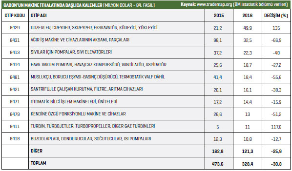 ihracat gerçekleştirdi. 2015 yılında söz konusu ürün grubunda 1,5 milyon dolarlık ürün ihraç edilirken 2016 yılında bu rakam, yüzde 101,9 artarak 3 milyon dolar seviyesinde kaydedildi. Listenin ikinci sırasında ise dozerler, greyder, skreyper, ekskavatör, küreyici, yükleyici vb. bulunuyor. Söz konusu kalemde 2015 yılında gerçekleştirilen ihracatın değeri 4,3 milyon dolarken 2016 yılında bu rakam yüzde 53,6 azalarak 2 milyon dolar seviyesinde kayda geçti. Listenin üçüncü sırasında bulunan palanga, vinç (basamaklı hariç) bucurgat, ırgat, krikolar kaleminde 2016 yılında 1,3 milyon dolar değerinde ihracat gerçekleştirildi. 2015 yılında bu rakam 116 bin dolar seviyesindeydi. Palanga, vinç (basamaklı hariç) bucurgat, ırgat, krikolar mal grubundaki ihracat 2016 yılında yüzde 989,7 arttı. Gabon’un 2016 yılında bir önceki yıla oranla ihracatını en fazla artırdığı ürün grubu yüzde 2.562,2 ile toprak, maden, cevheri taşıma, ayırma, seçme vb. iş makineleri oldu. Söz konusu kalemde 2015 yılında 37 bin dolarlık ihracat gerçekleştirilirken 2016 yılında bu rakam 985 bin dolar seviyesine yükseldi.