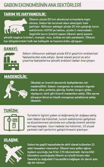 Gabon ekonomisi büyük ölçüde petrol, manganez ve orman ürünlerine dayanırken zengin doğal kaynakları ve az nüfusu ile de Sahra- Altı Afrika ülkelerine kıyasla yüksek kişi başı gelire sahip ülkeler arasındadır. Gabon’un cari fiyatlarla GSYİH’si 15 milyar dolar civarındadır. Cari fiyatlarla kişi başına düşen gelir ise 9-10 bin dolar civarında seyreder. Tarım sektörü, ülkenin GSYİH’sinin yüzde 5’ini oluştururken ekonomide öne çıkan ürün ise petrol. Petrol ihracatı, ülke gelirlerinin yaklaşık yüzde 63’ünü, GSYİH’nin ise yüzde 50’den fazlasını meydana getiriyor. Gabon hükümeti, ekonomik faaliyetlerde çeşitliliği artırmak amacıyla teşvik programları eşliğinde altyapı yatırımlarına yönelirken petrole olan bağımlılığı da azaltmaya çalışıyor. Dünya ekonomisinden yüzde 0,03 pay alan ülke eski bir Fransız sömürgesi olması nedeniyle Fransa ile ekonomik, politik ve siyasi bağları güçlü bir şekilde sürdürüyor. Gabon’un para politikası, bölgesel bir Merkez Bankası olan Orta Afrika Ülkeleri Bankası (Banque des Etats de l’Afrique Centrale-BEAC) tarafından belirlenip yürütülüyor. Para politikasında öncelik enflasyonun kontrolü ve CFA Frankı’nın euroya endeksli durumunun devam ettirilmesidir. Bankanın bağımsızlığı para politikasının siyasi etkilerden uzak olarak belirlenmesi ve sürdürülmesinin garantisini oluşturuyor.