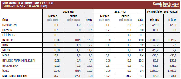 2017 yılının 1-31 Ocak döneminde Türkiye geneli gıda sanayi makineleri sektöründe en fazla ihracat artışının yaşandığı ülke yüzde 4.224,7 ile İngiltere oldu. İsveç yüzde 1.793,8 ile ikinci, Bulgaristan ise yüzde 231,7 ile üçüncü sırada yer aldı.