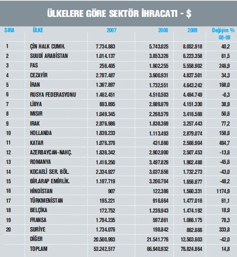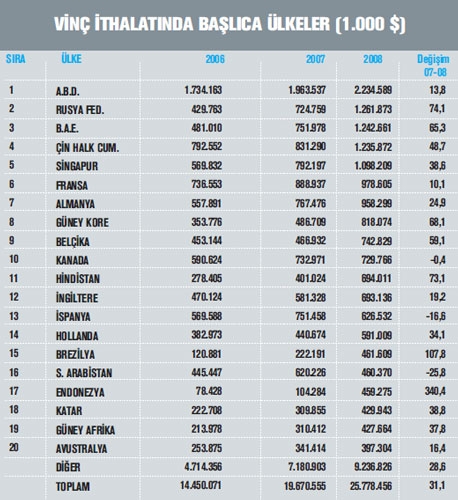 2008 yılında, dünya ithalatında önemli ülkelerde yaşanan değişimler incelendiğinde; yüzde 340,4 artış ile Endonezya’nın en fazla artış kaydeden ülkeler arasında ilk sırada yer aldığı ve bu ülkeyi Brezilya (yüzde 107,8) ile Rusya’nın (yüzde 74,1) takip ettiği görülüyor. Bu ülkeler arasında ithalatında en çok düşüş kaydedilen ülke ise Suudi Arabistan (yüzde 25,8) oldu. 2008 yılı sektör ithalatında ülkelere göre yapılan sıralamasında 26. konumda bulunan Türkiye, 319,3 milyon dolar değerinde ithalat gerçekleştirerek, dünya geneli ithalatından yüzde 1,2 pay aldı.