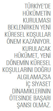 Türkiye önemli bir seçimi geride bıraktı. Seçim sonuçları, seçmenin geniş kapsamlı bir koalisyon isteğinde bulunduğu şeklinde yorumlanabilir. Nitekim çok geniş bir seçmen kitlesi Türkiye Büyük Millet Meclisinde temsil ediliyor. Türkiye için erken seçime gitmeden uzun süreli, reformcu ve icracı bir koalisyon hükümetinin kurulması en iyi senaryo olarak görülebilir. Ancak genel seçim sonuçlarının ötesinde küresel alanda oluşan yeni koşullara da dikkat etmemiz gerekiyor. Nitekim yeni koşullar 2015 yılında küresel ölçekte hissediliyor ve Türkiye’de de bu koşullar ekonominin yavaşlaması olarak ortaya çıkıyor. Bu nedenle hükümeti kim kurarsa kursun yeni dönemin küresel koşullarını doğru algılamazsa iç siyaset dinamiklerinin ötesinde başarı şansı olmaz. Bu çerçevede öncelikle yeni küresel koşulları değerlendirmekte fayda var.
