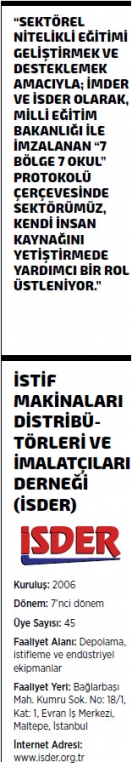 yılların başlarında depolamada ve dağıtımda sunduğu pratik çözümlerle yoğun şekilde kullanımına başlanan istifleme makinelerine yönelik talep günümüzde de devam ediyor. Gelişen teknolojiyle birlikte her geçen gün daha çok alana hitap eden istif makinaları sektörünün Türkiye’deki çatı kuruluşu İstif Makinaları Distribütörleri ve İmalatçıları Derneği (İSDER), 2006’da 15 kurucu üyenin bir araya gelmesiyle kuruldu ve bugüne kadar sürdürdüğü çalışmalarla sektör üyelerinin üretim ve satış stratejilerinde köklü gelişmeler yaşanmasına imkân tanıdı.