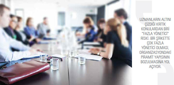 konuda Peppers and Rogers Group EMEA İK Müdürü Buse Tozar’ın görüşlerine başvuruyor: “Bir şirkette çok fazla yönetici olması, organizasyondaki piramit yapısının bozulmasına yol açıyor. Bu da uzun vadede olumsuz sonuçlar doğurabiliyor.” Özellikle orta ölçekli ve Anadolu şirketlerinde “sözde müdür” kavramının yaygın olduğunun altını çizen Yasemin Erdoğan, diğer yandan fazla yöneticinin göreceli bir kavram olduğunu, sektöre bağlı olarak farklılık gösterdiğini de anımsatıyor ve Msearch Consulting’den Ali Midilli’nin şu görüşünü paylaşıyor: “Üretim sektörü, bu konuda en yalını. Sanayi ve üretimde 100- 150 milyon TL cirolu bir şirkette şef seviyesi dâhil olmak üzere toplam yönetici kadrosu 12-15 kişi arasında değişir. Bunun fazlası zarardır. Çünkü görev alanı çatışmasına sebep olabilir.”