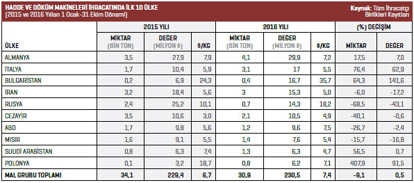 Hadde ve döküm makineleri sektöründe 2016 yılının Ocak-Ekim döneminde 230,5 milyon dolar değerinde ihracat gerçekleştirildi. 2015 yılının aynı döneminde bu rakam 229,4 milyon dolardı. Hadde ve döküm makineleri ürün grubundaki ihracat artışı yüzde 0,5 oldu.
