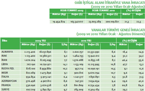 Türkiye vana ihracatı geçtiğimiz yılın Ocak-Ağustos dönemine göre 2010 yılının aynı zaman dilimi ile kıyaslandığında yüzde 22,5 oranında değer kazanmış durumda. 2009 yılının ilk 8 ayında 163 milyon 347 bin dolar olan vana ihracatımız 2010 yılının ilk 8 ayında ise 200 milyon 109 bin dolar olmuş. Vana ihracatımız ülkeler bazında incelendiğinde ise Almanya’nın en fazla ihracat gerçekleştirdiğimiz ülke olduğu görülüyor. Söz konusu ülkeye 2010 yılının Ocak-Ağustos ayları arasında 22 milyon 532 bin dolarlık vana ihracatı yapılmış. Almanya’nın ardından en fazla vana ihracatımız olan ikinci ülke ise Irak. Bu ülkeye geçtiğimiz yılın ilk sekiz aylık döneminde 10 milyon 386 bin dolarlık vana ihracatı söz konusu iken 2010 yılının aynı dönemine gelindiğinde yüzde 34,2 oranında değer artışı yakalanarak 13 milyon 942 bin dolarlık ihracat yapılmış. İran ise vana ihracatımızın en fazla olduğu üçüncü pazar konumunda. İran’a geçtiğimiz yılın ilk 8 aylık döneminde 8 milyon 263 bin dolarlık vana ihracatı gerçekleştirilmişken 2010 yılının aynı dönemine gelindiğinde ise yüzde 55,6 oranında değer artışı ile 12 milyon 855 bin dolarlık ihracat kaydedilmiş. Vana ihracatında en önemli değer artışı ise yüzde 84 ile Fransa’yla yaşanmıştır. Söz konusu ülkeye 2009 yılının Ocak-Ağustos döneminde 3 milyon 670 bin dolarlık ihracat gerçekleştirilirken, 2010 yılının aynı döneminde bu rakam 6 milyar 754 milyon dolara çıkmıştır.Azerbaycan ise vana ihracatımızın en fazla olduğu pazarlardan biri konumunda.İran’a geçtiğimiz yılın ilk 8 aylık döneminde 4 milyon 967 bin dolarlık vana ihracatı gerçekleştirilmişken 2010 yılının aynı dönemine gelindiğinde ise yüzde 42 oranında değer artışı ile 7 milyon 54 bin dolarlık ihracat kaydedilmiş. Vana ihracatında bir diğer önemli değer artışı ise yüzde 31,5 ile İtalya’yla yaşanmıştır. Söz konusu ülkeye 2009 yılının Ocak-Ağustos döneminde 5 milyon 973 bin dolarlık ihracat gerçekleştirilirken, 2010 yılının aynı döneminde bu rakam 7 milyon 856 bin dolara çıkmıştır.
