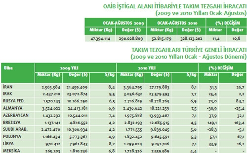 Makine ihracatının en önemli kalemlerinden biri olan takım tezgahları ihracatı geçtiğimiz yılın Ocak-Ağustos dönemine göre 2010 yılının aynı zaman dilimi ile kıyaslandığında yüzde 10,8 oranında değer kazanmış durumda. 2009 yılının ilk 8 ayında 296 milyon 28 bin dolar olan takım tezgâhları ihracatımız 2010 yılının ilk 8 ayında ise 328 milyon 123 bin dolar olmuş. Takım tezgahları ihracatımız ülkeler bazında incelendiğinde ise İran’ın en fazla ihracat gerçekleştirdiğimiz ülke olduğu görülüyor. Söz konusu ülkeye 2010 yılının Ocak-Ağustos ayları arasında 27 milyon 179 bin dolarlık takım tezgahı ihracatı yapılmış. İran’ın ardından en fazla takım tezgahı ihracatımız olan ikinci ülke ise Irak. Bu ülkeye geçtiğimiz yılın ilk sekiz aylık döneminde 23 milyon 72 bin dolarlık takım tezgahı ihracatı söz konusu iken 2010 yılının aynı dönemine gelindiğinde yüzde 2,2 oranında değer artışı yakalanarak 23 milyon 579 bin dolarlık ihracat yapılmış. Rusya ise takım tezgahları ihracatımızın en fazla olduğu üçüncü pazar konumunda. Rusya’ya geçtiğimiz yılın ilk 8 aylık döneminde 10 milyon 166 bin dolarlık takım tezgahı ihracatı gerçekleştirilmişken 2010 yılının aynı dönemine gelindiğinde ise yüzde 84,2 oranında değer artışı ile 18 milyon 728 bin dolarlık ihracat kaydedilmiş. Takım tezgahı ihracatında en önemli değer artışı ise yüzde 163,4 ile Brezilya’yla yaşanmıştır. Söz konusu ülkeye 2009 yılının Ocak-Ağustos döneminde 4 milyon 816 bin dolarlık ihracat gerçekleştirilirken, 2010 yılının aynı döneminde bu rakam 12 milyar 685 milyon dolara çıkmıştır. Polonya ise takım tezgahları ihracatımızın en fazla artış yaşadığı pazarlardan biri konumunda. Polonya’ya geçtiğimiz yılın ilk 8 aylık döneminde 5 milyon 773 bin dolarlık takım tezgahı ihracatı gerçekleştirilmişken 2010 yılının aynı dönemine gelindiğinde ise yüzde 67,1 oranında değer artışı ile 9 milyon 645 bin dolarlık ihracat kaydedilmiş. Takım tezgahı ihracatında en önemli değer artışı ise yüzde 32,1 ile Azerbaycan’la yaşanmıştır. Söz konusu ülkeye 2009 yılının Ocak-Ağustos döneminde 10 milyon 544 bin dolarlık ihracat gerçekleştirilirken, 2010 yılının aynı döneminde bu rakam 13 milyon 933 bin dolara çıkmıştır.