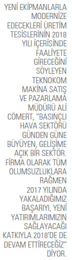 Teknokom Makina olarak 2017 yılında koyduğumuz hedefleri ülke ekonomisindeki zorluklara rağmen yüzde 97 seviyesinde gerçekleştirdik. 2018 yılının daha zor geçeceğini değerlendirsek de yeni fabrika yatırımımız başta olmak üzere çalışmalarımıza devam ediyoruz. Bu nedenle hedeflerimizi makul bir seviyede tutarak ve çok daha sıkı çalışarak 2018 yılında da hedeflerimize ulaşacağımızı düşünüyorum.