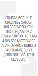 Hâlihazırda Bursa Ovaakça’da bulunan fabrikamızda üretimimizi sürdürüyoruz. Bursa Görükle Organize Sanayi Bölgesi’ndeki yeni tesis inşaatımız devam ediyor. Toplam 4 bin 500 metrekare alan üzerine kurulu fabrikamız bu yıl içerisinde faaliyete geçecek. Bununla birlikte makine ve ekipman yenileme çalışmalarımız için önemli bir bütçe ayırdık. Yeni ekipmanlarla modernize edeceğimiz üretim tesisimiz yakın zamanda hizmet vermeye başlayacak.