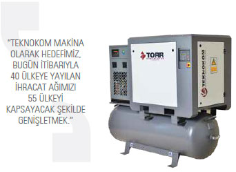 Bursa’da 1994 yılında Nermin Cömert tarafından kurulan Teknokom Makina, basınçlı hava kompresörleri ve ekipmanları alanında faaliyet yürütüyor. Kuruldukları dönemde sektördeki önemli kompresör firmalarının bölge bayisi olarak çalışmalarını sürdürdüklerini söyleyen Teknokom Makina Satış ve Pazarlama Müdürü Ali Cömert 2011 yılında ise kurumsal çalışmaları tamamlayarak TORR markasıyla kendi ürünlerini imal edip, Türkiye ve dünya pazarına sunmaya başladıklarını belirtiyor. “Bu noktada önceliğimiz, özellikle kendi bölgemizde önemli referanslar oluşturarak gücümüzü ve hizmetimizi geniş alanlara yaymak oldu” diyen Cömert, firmalarının bugün itibarıyla aralarında Hollanda, Çekya, İngiltere, Almanya, Slovenya, Hırvatistan, Kosova, Bosna-Hersek, Sırbistan, Bulgaristan, Irak, Birleşik Arap Emirlikleri, Vietnam, Sri Lanka ve ABD’nin de yer aldığı dünyanın 40 ülkesine imal ettikleri tüm kalemlerde ihracat gerçekleştirdikleri bilgisini veriyor.