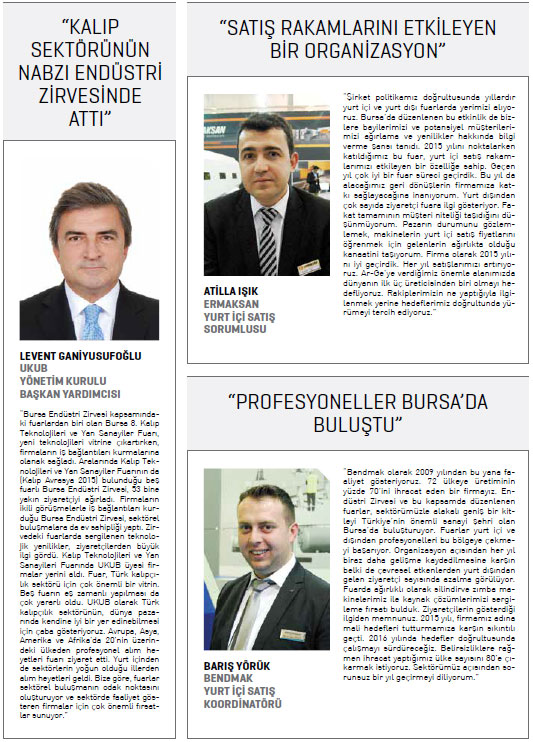 Bu yıl beş büyük organizasyon Bursa Ticaret ve Sanayi Odası (BTSO), Makina İmalatçıları Birliği (MİB), Takım Tezgahları Sanayici ve İş Adamları Derneği (TİAD) ve Ulusal Kalıp Üreticileri Birliği (UKUB) işbirliğinde, Ekonomi Bakanlığı, KOSGEB ve Bursa Büyükşehir Belediyesi’nin destekleriyle “Bursa Endüstri Zirvesi” adı altında eş zamanlı olarak 10-13 Aralık tarihleri arasında Bursa Uluslararası Fuar ve Kongre Merkezi’nde gerçekleştirildi. Endüstri Zirvesi kapsamında; Metal İşleme Teknolojileri, Sac İşleme Teknolojileri, Kalıp Avrasya, Otomasyon ile İş ve İşçi Güvenliği, Sağlığı ve Ekipmanları Fuarlarına 21 ülkeden 605 firma katıldı. Dört gün süren organizasyonu 48 ülkeden 52 bin 770 ziyaretçi takip etti. Geçtiğimiz yıla göre yüzde 15 büyüme ile kapılarını açan, hidrolikten pnömatiğe, sac işleme teknolojilerinden kalıp yan sanayisine,