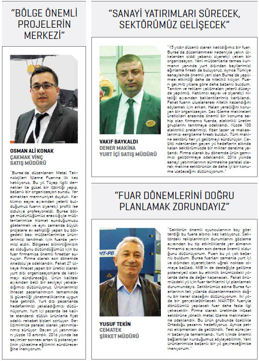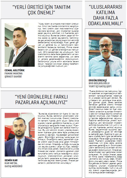 Fuarın açılında konuşan TÜYAP Bursa Fuarcılık A.Ş. Genel Müdürü İlhan Ersözlü, 2015 yılının son fuarını gerçekleştirdiklerini belirterek, “Bursa Endüstri Zirvesi imalat sanayisinin her evresini, imalat sürecini temsil eden bir zirve. Bu zirve endüstriyi tek çatı altında topluyor. Üretimin her safhasında kullandığımız makineleri, savunma sanayisinden uzay havacılık, medikal ekipmanlardan tarım ve gıda makinelerine kadar her sektörde üretim yapan makineleri yapan makineler fuarda sergileniyor” dedi. Durgun geçen bir dönemden sonra bütün sektörün bu fuarı beklediğini anlatan Ersözlü, “Ertelenen ve beklenen alımlar bu fuarda olacak. 10 bin liradan 1,5 ve 2 milyon liraya kadar farklı dilim içinde takım tezgahları fuarda yer alıyor” şeklinde konuştu.