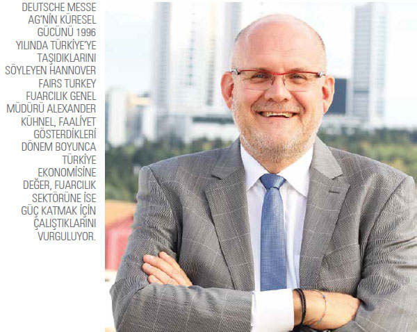 Deutsche Messe AG’nin dünyanın en büyük 10 fuar şirketi arasında yer aldığını ifade eden Hannover Fairs Turkey Fuarcılık’ın Genel Müdürü Alexander Kühnel, fuar şirketinin Türkiye’deki temsilcisi olarak, fuarların planlanması, organizasyonu ve uygulamasından sorumlu olduklarını söylüyor. Fuarların gerçekleştiği ülke ve şehrin ekonomisine birçok açıdan katkı sağladığını ifade eden Kühnel, bu platformların müşterilerle tedarikçileri buluşturan bir köprü vazifesi gördüğünü dile getiriyor. Değerlendirmesini rakamlar ışığında devam ettiren Kühnel, “Son 10 yılda 100 binin üzerinde yabancı firmanın sadece fuar katılımı için Türkiye’ye geldiğini görüyoruz. Türkiye’de düzenlenen fuarlardan 200’den fazlasına İstanbul ev sahipliği yapıyor. İstanbul, 20 milyon olan Türkiye geneli fuar ziyaretçi sayısının 7 milyon kadarını tek başına ağırlıyor. Şehirde