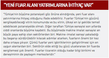 Türk firmalar da özellikle son yıllarda fuarların bu avantajından daha yoğun faydalanıyor. Bundan 10 yıl öncesine göre, Türk üreticilerin hem yurt içi hem de yurt dışı fuarlara katılımlarında büyük artış yaşanıyor. Fuarları iş yaratmak için kullanma noktasında Türkiye’de çok etkin bir yapı var. Tabii bu noktada devlet desteği de çok önemli bir rol oynuyor. Bakanlık ulusal ve uluslararası tüm fuarlara katılımları teşvik etmek amacıyla katılımcılara büyük destek sağlıyor. Kendine özgü bir formül üreterek farklılaşma, fuar katılımlarında önemli bir yere sahip. Türkiye’deki firmaları göz önüne aldığınızda, bunu ne kadar başardığımızı söyleyebiliriz. Uluslararası rekabet koşulları altında, bir firmanın ya da bir ürünün benzerlerinden farklılaşma noktasında sürekli düşünmesi, yeni stratejiler geliştirmesi gerekir. Özellikle sektörel fuarlarda dikkat çekmek ve ziyaretçileri stantların önünde durdurabilmek çok önemlidir. Katılımcı firmalarımızın görevli personelinin iyi düzeyde İngilizce bilgisine sahip olması, stantta iyi bir pazarlama uzmanı olması da aynı şekilde gereklidir.