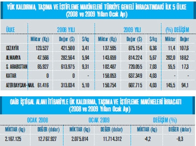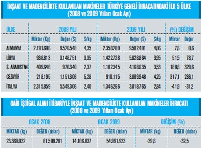 Ülkemiz inşaat ve madencilik makineleri ihracatı da 2008’in ilk ayına göre bu yılın ilk ayında azalış gösteren mal grupları ndan biri. Geçtiğimiz yılın Ocak ayından 81 milyon 508 bin dolar olan inşaat ve madencilik makineleri ihracatımız 2009 yılının aynı dönemine gelindiğ inde 54 milyon 991 bin dolar seviyesine gerilemiş. İnşaat ve madencilik makineleri ihracatımız ülkeler bazında incelendiğinde ise Almanya’nı n birinci sırada yer aldığı görülüyor. Bu ülkeye 2008 yılı- nın ilk ayında 9 milyon 526 bin dolar değerinde inşaat ve madencilik makineleri ihracatı yapı lmışken 2009 yılının Ocak ayına gelindiğinde ise yüzde 0,6 oranında değer artışı yakalanarak 9 milyon 582 bin dolarlı k inşaat ve madencilik makineleri ihracatı yapılmış. Almanya’nı n ardında inşaat ve madencilik makineleri ihracatı- mızın en fazla olduğu ikinci ülkenin ise Libya olduğu görülüyor. Libya’ya 2008 yılının ilk ayında 3 milyon 148 bin dolar inşaat ve madencilik makineleri ihracatı yapan firmalarımız 2009 yılının ilk ayına gelindi- ğinde ise bu değeri yüzde 78,7 oranında artırarak 5 milyon 626 bin dolar seviyesine yükseltmişler. İnşaat ve madencilik makineleri ihracatımızın üçüncü en büyük pazarı ise 2009 yı- lının Ocak dönemine göre Suudi Arabistan olmuş. Suudi Arabistan’a 2008 yılının ilk ayında 970 bin dolar inşaat ve madencilik makineleri ihracatı yapılırken 2009 yılının aynı dönemine gelindiğinde ise yüzde 329,6 oranında değer artışı ile 4 milyon 168 bin dolar seviyesine ulaşılmış. İnşaat ve madencilik makineleri ihracatımızın en hızlı oranda arttığı ülke yüzde 329’la Suudi Arabistan olurken, bu ülkeyi yüzde 236,1 değer artışı ile Cezayir takip etmiş. Söz konusu ülkeye 2008 yılının Ocak ayında 1 milyon 151 bin dolar inşaat ve madencilik makineleri ihracatı yapılırken 2009 yılının aynı dönemine gelindiğinde ise bu değer 3 milyon 869 bin dolar olmuş.