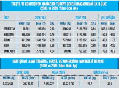 Ocak ayı ihracatımızın iyi oldu- ğunu söyleyemem. Geçen seneye göre düşüş yaşadık. Bu ay 2 çı- kış oldu biri 13 bin 800 Euro de ğerinde, diğeri ise 4 bin dolar. Bu sene beklentimiz hem yurt içi hem de yurt dışı fuarlardan alacağımız siparişlerde. Özellikle Hindistan ve Bangladeş’teki durumu fuarlara gittiğimizde daha net görme şansımız olacak. Sektörümüzün problemleri arasında kur dalgalanması nın doğurduğu sorunlar var. Aslında şu anda biraz daha iyi durum. İhracatta herkesin yaşadığı sorunları biz de yaşıyoruz. 27 kişiyi istihdam eden bir firmayız ve yaptığımız ihracat bu istihdamı sağlayacak bir rakam değil. Açıkçası şu andaki umudumuz Hindistan’da gerçekleşecek olan fuarda ve arından da Haziran’da Türkiye’deki fuar gelecek. Sektör olarak 2009 Ocak ayı ihracatımız ise 13 milyon 226 bin dolar, geçtiğimiz yılın aynı dönemindeki ihracat rakamı ise 20 milyon 787 bin dolar. Bu sene tekstil makineleri sektörü olarak yüzde 36,4’lük bir düşüş yaşadık.