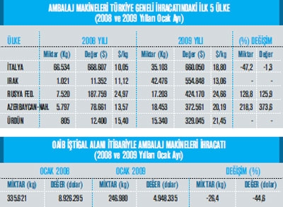 Türkiye ambalaj makineleri ihracatı mız 2008 yılının Ocak ayı- na göre 2009’un Ocak ayına gelindiğinde değer bazında yüzde 44,6 oranında gerileme yaşadığı görülüyor. Geçtiğimiz yılın Ocak ayından 8 milyon 926 milyon dolar olan ambalaj makineleri ihracatımız 2009 yı- lının aynı dönemine gelindi- ğinde 4 milyon 948 bin dolar seviyesine gerilemiş. Ülkeler bazında bu mal grubundaki ihracat verileri incelendiğ inde ise İtalya’nın en fazla ihracat gerçekleştirdiğimiz ülke olduğu görülüyor. Söz konusu ülkeye 2008 yılının Ocak ayında 668 bin dolarlık ambalaj makineleri ihracatı yapılmışken 2009’un ilk ayına gelindiğinde ise yüzde 1,3 oranında değer artışı ile bu ülkeye 660 bin dolarlı k ihracat yaptığımız kaydedilmiş. İtalya’nın ardından en fazla ambalaj makineleri ihracatı mız olan ikinci ülke ise Irak. Bu ülkeye 2008 yılının ilk ayında 11 bin dolarlık ambalaj makineleri ihracatı varken 2009 yı- lının ilk ayına gelindiğinde ise ciddi bir yükselişle 554 bin dolar seviyesi yakalanmış. Irak’a olan ambalaj makineleri ihra catımızdaki bu yüksek artışın ardından bu mal grubundaki üçüncü en büyük pazarımızın ise Rusya Federasyonu olduğu görülüyor. Rusya Federasyonu’na 2008 yılının Ocak ayında 187 bin dolarlı k mal gönderen ambalaj makineleri ihracatçılarımız 2009 yılının aynı dönemine gelindiğ inde ise yüzde 125,9 oranı nda değer artışı yaratarak 424 bin dolar seviyesine ulaşmı ş durumdalar. Ambalaj makineleri ihracat artış hızı ülkeler bazında değerlendirildiğinde ise Irak’ın ardından Sudan’ı n yüzde 540,3 oranında değer artışı ile en hızlı büyüyen ikinci pazar olduğu görülüyor. Sudan’a 2008 yılının ilk ayında 35 bin dolarlı ambalaj makineleri ihracatı söz konusu iken 2009’un ilk ayına gelindi- ğinde ise 224 bin dolar değerine ulaşıldığı görülüyor. Ambalaj makineleri ihracatımızın en fazla artış gösterdiği üçüncü ülke ise Azerbaycan. Bu ülkeye olan ambalaj makineleri ihracatı mız 2008 yılının Ocak dönemine göre 2009’un ilk ayında değer bazında yüzde 373,6 oranında yükseliş kaydedilmiş.