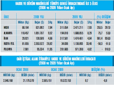 Ülkemiz hadde ve döküm makineleri ihracatı 2008 yılının ilk ayında 21 milyon 179 bin dolar olarak gerçekleşirken 2009 yılının aynı dönemine gelindi- ğinde ise yüzde 8,8 oranında azalış kaydederek 19 milyon 322 bin dolar olmuş. Hadde ve döküm makineleri ihracatımız ülkeler bazında incelendiğ inde ise Mısır’ın bu mal grubu içerisinde en fazla ihracat gerçekleştirdiğimiz pazar olduğu görülüyor. Söz konusu ülkeye 2008 yılının Ocak döneminde 621 bin dolarlık hadde ve döküm makineleri yapılmışken yüzde 297,9 oranı nda artış kaydedilerek 2 milyon 471 bin dolarlık ihracat gerçekleştirilmiş. Mısır’ın ardı ndan en fazla hadde ve döküm makineleri ihracatı yaptı- ğımız ikinci ülke ise Almanya olmuş. Almanya’ya 2008 yılı- nın ilk ayında 1 milyon 51 bin dolarlık hadde ve döküm makineleri ihracatı gerçekleştirilmişken 2009 yılının ilk ayına gelindiğinde ise yüzde 53 oranı nda değer artışı yakalanarak 1 milyon 608 bin dolar seviyesine ulaşılmış. Hadde ve döküm makinelerini ihracatımı- zın en fazla olduğu üçüncü ülke ise İran olmuş. İran’a 2008 yılının ilk ayında 139 bin dolar hadde ve döküm makineleri ihracatı gerçekleştiren firmaları mız 2009 yılının aynı dönemine gelindiğinde ise yüzde 956,9 oranında ciddi bir değer artışı kaydederek bu mal grubu için ihracatımızı 1 milyon 474 bin dolara taşımış. Ülkeler bazında hadde ve döküm makineleri ihracatımızın en hızlı geliştiği yer Ege Ser best Bölgesi olurken, yüzde 956,9 oranında de değer artışı ile İran bu mal grubu için en hızlı artan ülke olmuş. İran’ın ardından ise hadde ve döküm makineleri ihracatımızın en hızlı şekilde yükseldiği ülkenin yüzde 918,9 Polonya olduğu görülüyor.