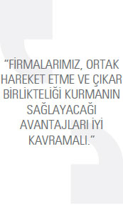 Firmalarımız, ülkemizde halen eksikliğini hissettiği ortak hareket etme ve çıkar birlikteliği kurmanın sağlayacağı avantajları iyi kavramalı. Birlikten doğacak güç sadece makine sektöründeki örnek çalışmalarla sınırlı kalmamalı. Tüm sanayi sektörlerini bir araya getirilmesiyle organizasyonumuzun avantajlarını daha geniş bir ortama yaymak istiyoruz.