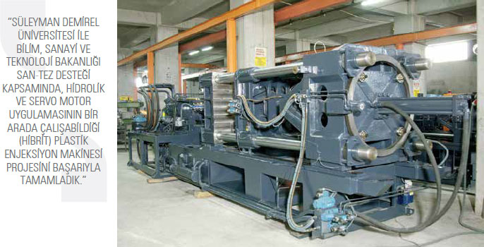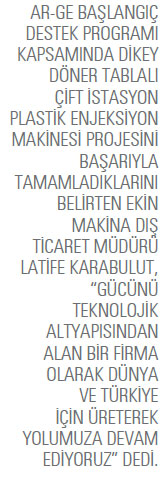 Ekin Makina’nın yürüttüğü TÜBİTAK projeleri kapsamında da bilgi veren Karabulut şunları söyledi: “Süleyman Demirel Üniversitesiyle Bilim, Sanayi ve Teknoloji Bakanlığı San-Tez Desteği kapsamında, hidrolik ve servo motor uygulamasının bir arada çalışabildiği (hibrit) plastik enjeksiyon makinesi projesini ve TÜBİTAK KOBİ Ar-Ge Başlangıç Destek Programı kapsamında da dikey döner tablalı çift istasyon plastik enjeksiyon makinesi projesini başarıyla tamamladık. Tamamlanan bu projelerin haricinde halen çalışmalarını sürdürdüğümüz TÜBİTAK KOBİ Ar-Ge projelerimiz de mevcut.”