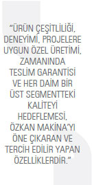 biz, müşteri odaklı bir firmayız. Dünyanın pek çok farklı bölgesi için tasarlanmış özel ürün gruplarımız var. Amacımız memnun ve sürekli çalışabileceğimiz müşterilere sahip olmak. Bu nedenle onları çok iyi dinliyor, isteklerine uygun malzemeyi veya çözümü üretmek için çalışıyoruz. ÖZKAN Makina’nın müşterileri, dünyanın neresinde olurlarsa olsunlar, ihtiyaç duyduklarında yanlarında olacağımızı bilirler. Müşterilerimizden ve son kullanıcılarımızdan gelen geri beslemeleri ve önerileri mutlaka değerlendiriyoruz. Bazen bu yorumlar tamamen bir müşteriye özel bir ürün programıyla bile sonuçlanabiliyor. Bu da, uzun yıllar çalışacağınız sadık bir müşteriniz daha oldu anlamına geliyor. Özetle, ürün çeşitliliği, deneyimi, projelere uygun özel üretimi, zamanında teslim garantisi ve her daim bir üst segmentteki kaliteyi hedeflemesi, ÖZKAN Makina’yı öne çıkaran ve tercih edilir yapan özelliklerdir.