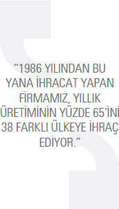 k üretimimizin yüzde 65’ini 38 farklı ülkeye ihraç ediyoruz. İhracattaki başarımız kalitemizin de göstergesidir. Avrupa, Afrika, Asya, Ortadoğu ülkeleriyle Türk Cumhuriyetleri ağırlıklı ihraç pazarlarımızı oluşturuyor. Son yıllarda özellikle Avrupa’daki bilinirliğimizin artmasının ardından çok sayıda bayilik talebi alıyoruz. Avrupalı rakiplerimizin fiyatları bize göre iki-üç kat yüksek. Fuarlara makinelerimizle katılmanın bir başka avantajını yine bu noktada görmüş bulunuyoruz. Ziyaretçilerimiz, muadilleriyle benzer ve hatta bazı noktalarda daha iyi kalitede olan ürünlerimizi yarı fiyatına alabildiklerini gördükten sonra tercihlerini değiştiriyor. 2015 yılının sonuna doğru yurt dışı bayilik çalışmalarımız çerçevesinde önemli adımlar atacağız” dedi.
