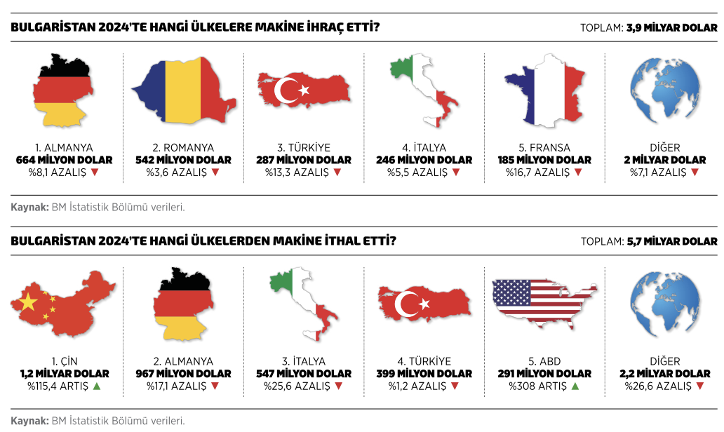 Ülkenin ekonomik verileri ve makine özelinde güncel ticaret rakamlarını incelediğimizde, BM İstatistik Bölümü verilerine göre Bulgaristan’ın makine ihracatının, 2024’te yüzde 7,7 azalarak 3,9 milyar dolar olarak kayda geçtiğini görüyoruz. Bulgaristan’ın en çok makine ihraç ettiği ülkeler sıralamasında ise ilk sırada 664 milyon dolarla Almanya, ikinci sırada 542 milyon dolarla Romanya ve üçüncü sırada 287 milyon dolarla Türkiye yer alıyor. Aynı dönemde Bulgaristan’ın toplam ihracatının 47,6 milyar dolar olduğunu ve makine ihracatının toplam ihracattan yüzde 8,3 pay aldığını da söyleyelim. Diğer yandan makine ithalatının, 53,8 milyar dolarlık toplam ithalattan yüzde 10,5 pay aldığı Bulgaristan’da, 2024’te yüzde 5,8’lik düşüşle 5,7 milyar dolar tutarında makine ithal edildi. BM İstatistik Bölümü verilerine göre Bulgaristan’ın en fazla makine ithal ettiği ilk 10 ülke listesinin ilk sırasında 1,2 milyar dolarla Çin yer alıyor. Listenin ikinci sırasında bulunan Almanya’dan 967 milyon dolar değerinde makine ithal edilirken, üçüncü sıradaki İtalya’dan 2024’te ithal edilen makinelerin değeri ise 547 milyon dolar oldu. Bu dönemde Bulgaristan'ın makine ithalatında dördüncü sırada yer alan Türkiye’den de yüzde 1,2’lik düşüşle 399 milyon dolarlık ithalat gerçekleştirildi. Bu veriyle, Bulgaristan'ın toplam 5,7 milyar dolarlık makine ithalatından 2024’te Türkiye’nin aldığı payın yüzde 7 oranında gerçekleştiğini; Bulgaristan'ın Türkiye’den yaptığı 4,7 milyar dolarlık toplam ithalat içinde makinenin payının ise yüzde 8,5 olduğunu söyleyebiliriz.